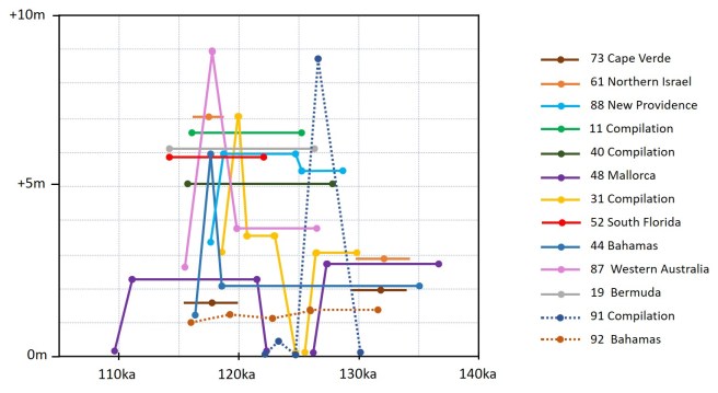 Giaccio (2024)(97), Mauz et al (2018)(98), Polyak et al (2018)(97) and Tuccimei et al (2012) (59) concluded, independently, from their spleothem- and sedimentological-based research in Italy, North Africa and Mallorca that while there is some evidence for a late peak (119–115 ka), if it occurred, it did not exceed +3m.