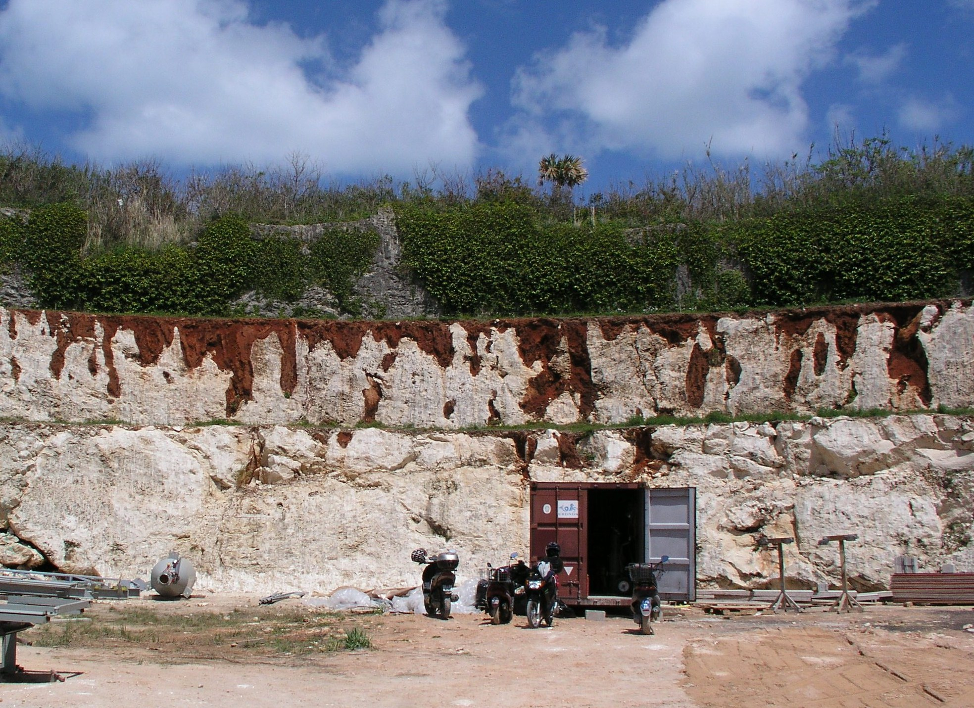 An alternative explanation for the composition of these “red” soils is that the non-carbonate minerals, including silica, are actually not so foreign, and largely comprise material that was derived locally from the Bermuda volcanic seamount (PR1). When sea levels were low, during glacial periods of the Pleistocene Epoch, the edge of the Bermuda platform would have been exposed to wave erosion. Resultant beaches of volcanic sand would, it is argued, have provided a source of iron-rich (red) material to be carried landward by the wind and accumulate on the land surface as a component of the soil.
